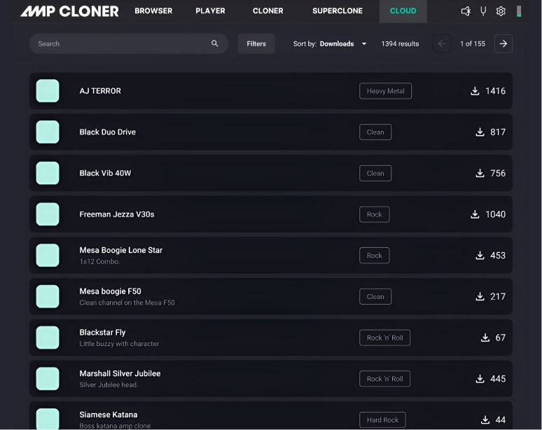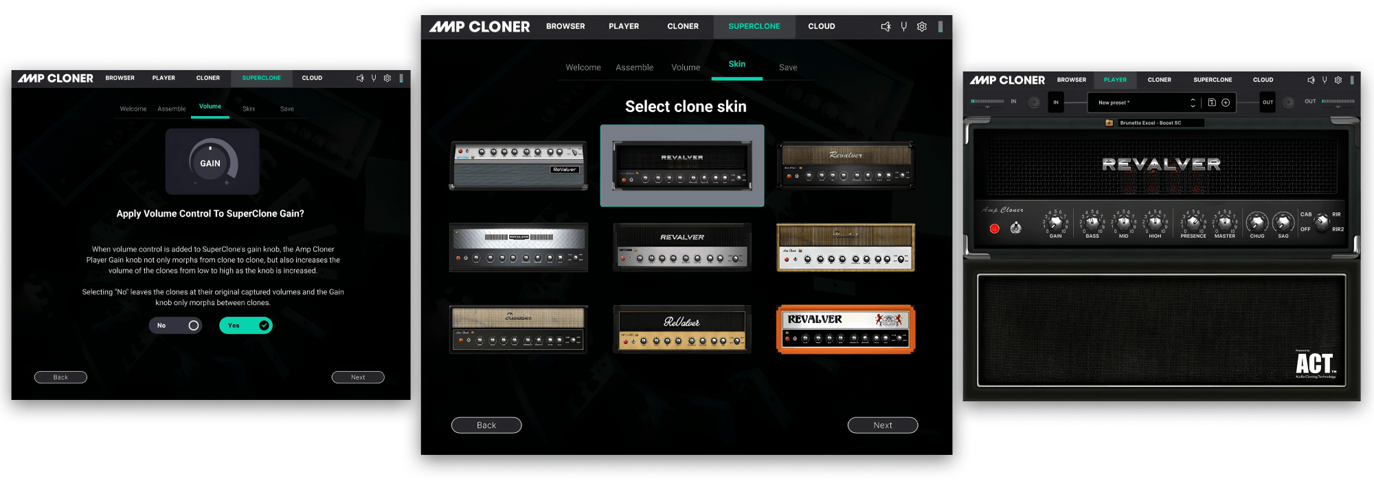 Amp Clone's SuperClone functionality allows the user to combine multiple clones into a SuperClone, with the Amp Cloner Player's Gain knob seamlessly morphing between clones and retaining the integrity of the source gear. Now clones become actual amp/pedal models. You can even take SuperClones to the next level by combining clones from different amps.
